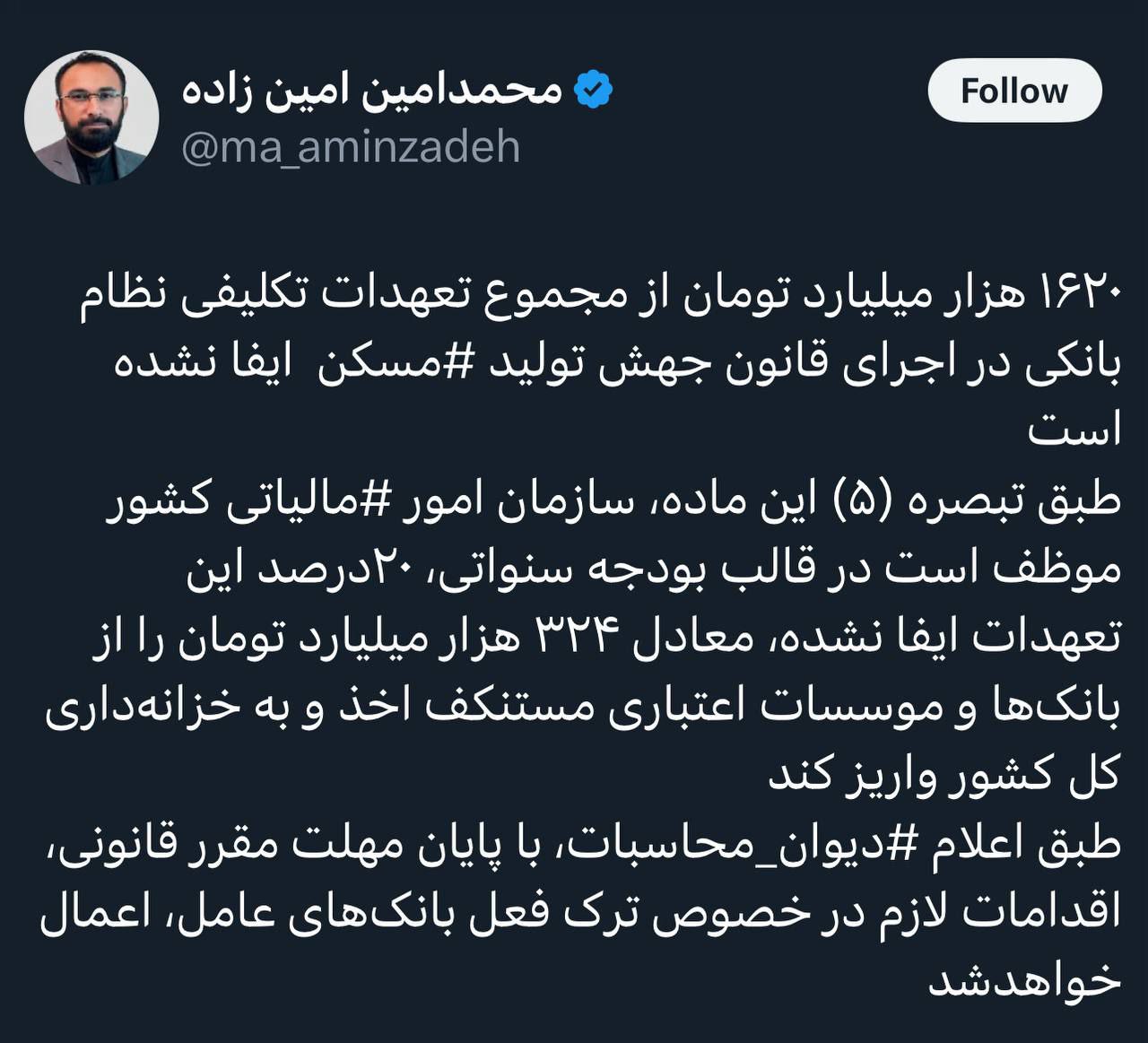 ۱۶۲۰ هزار میلیارد تومان از مجموع تعهدات تکلیفی نظام بانکی در اجرای قانون جهش تولید #مسکن ایفا نشده است