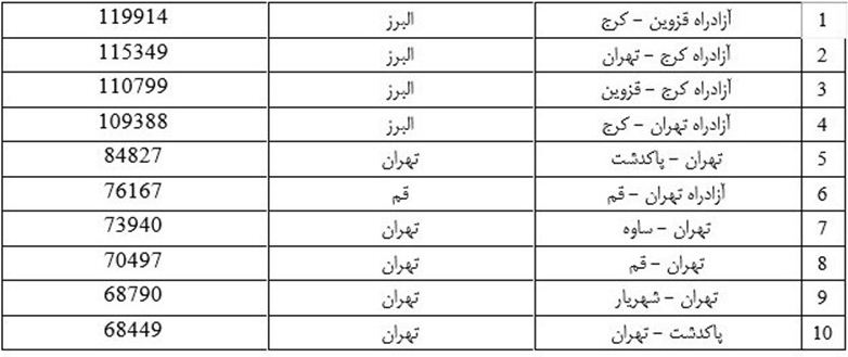 محورهای دارای بیشترین تردد در 24 ساعت گذشته