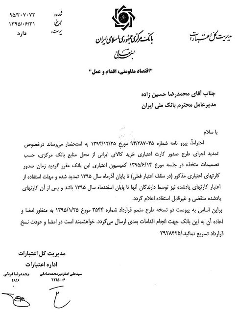 وی همچنین اعلام کرد که برخلاف آن‌چه که مطرح می‌شود، تمدید طرح کارت‌ اعتباری خرید کالای ایرانی بر اساس بخشنامه بانک مرکزی در تاریخ ۳۱ شهریور ماه  امسال به شبکه بانکی ابلاغ شده است.