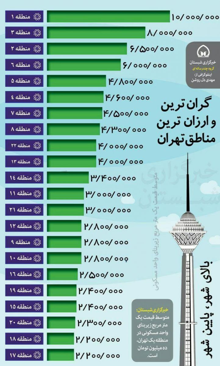 به گزارش ايران خبر، در اینفوگرافیک زیر گران‌ترین و ارزان‌ترین مناطق تهران را می‌بینید.